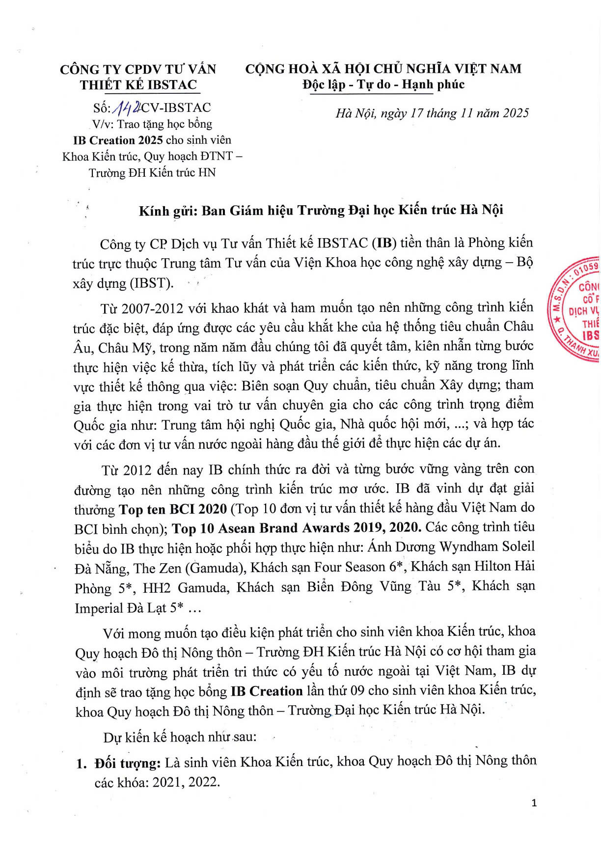 Nhằm tạo điều kiện cho sinh viên Khoa Kiến trúc và Khoa Quy hoạch Đô thị – Nông thôn, Trường Đại học Kiến trúc Hà Nội có cơ hội tiếp cận môi trường học thuật quốc tế và phát triển tri thức chuyên ngành, IBSTAC Architects & Planners dự kiến trao Học bổng IB Creation lần thứ 09 dành cho sinh viên xuất sắc thuộc hai khoa.